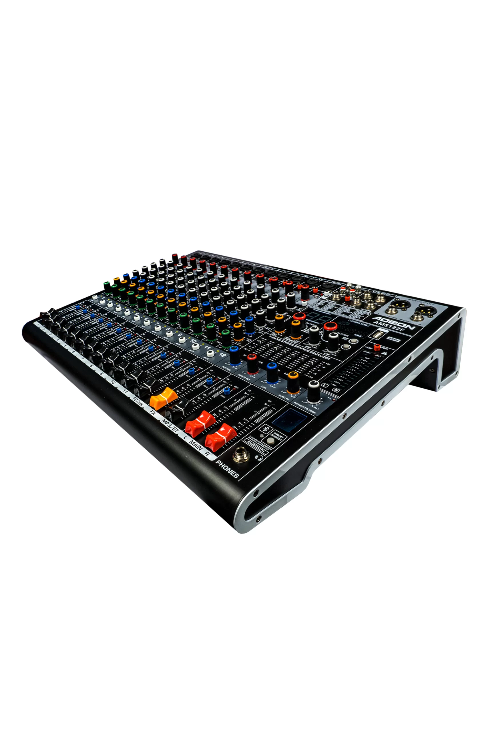 The Adeon AMS122E is a compact yet powerful mixer designed for versatile live and portable use. It features two XLR mic inputs with independent 48 V phantom power for condensers, each channel sporting a 4-band EQ, while the master section offers a 7-band graphic EQ. You can route channels into a single subgroup before sending to the main output and enjoy the HI-2 function, which likely supports high-gain or instrument-level inputs. Playback options include onboard MP3 via USB/SD and Bluetooth streaming, and it supports dual AUX-to-FX sends alongside 99 built-in DSP effects for processing like reverb or delay