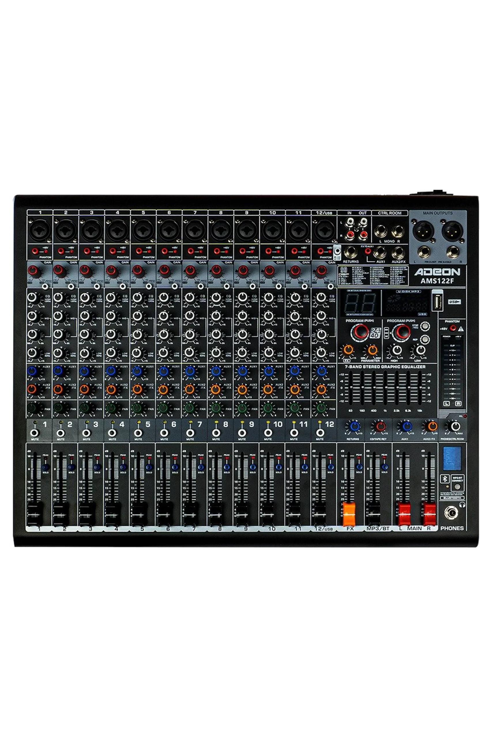 The Adeon AMS‑122E likely features 12 XLR mic/line inputs, each with 4‑band tone control and phantom power, delivering clean sound for vocals and instruments. A Hi‑Z input supports electric guitar or bass connection without needing a DI box. The 7‑band stereo graphic EQ on the main output lets you fine-tune overall mix clarity.
