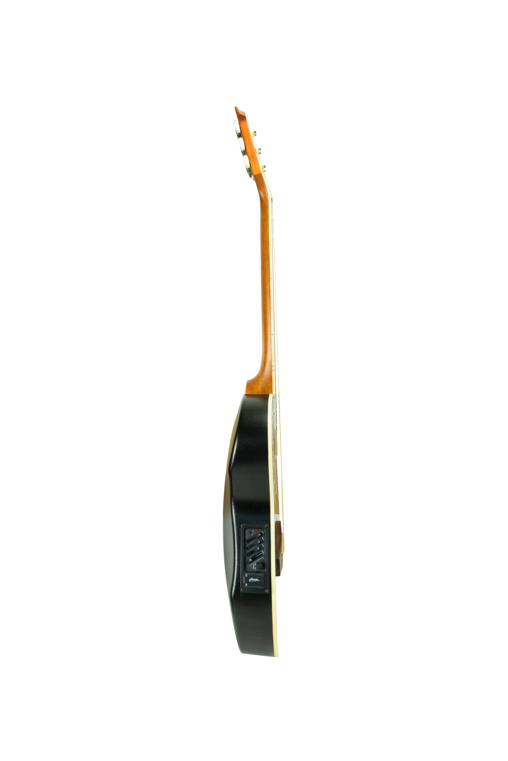 The Hertz HZA‑3801 NA is a 39″ steel-string semi-acoustic guitar featuring a linden (basswood) top, PVC back & sides, a nato neck, and rosewood fingerboard with 24 frets, complemented by a maple bridge, die-cast tuning machines, and a glossy finish. It includes a 4‑band onboard EQ and is designed for both unplugged and amplified play, offering warm mids and bright trebles in a lightweight, beginner‑friendly concert-style body.